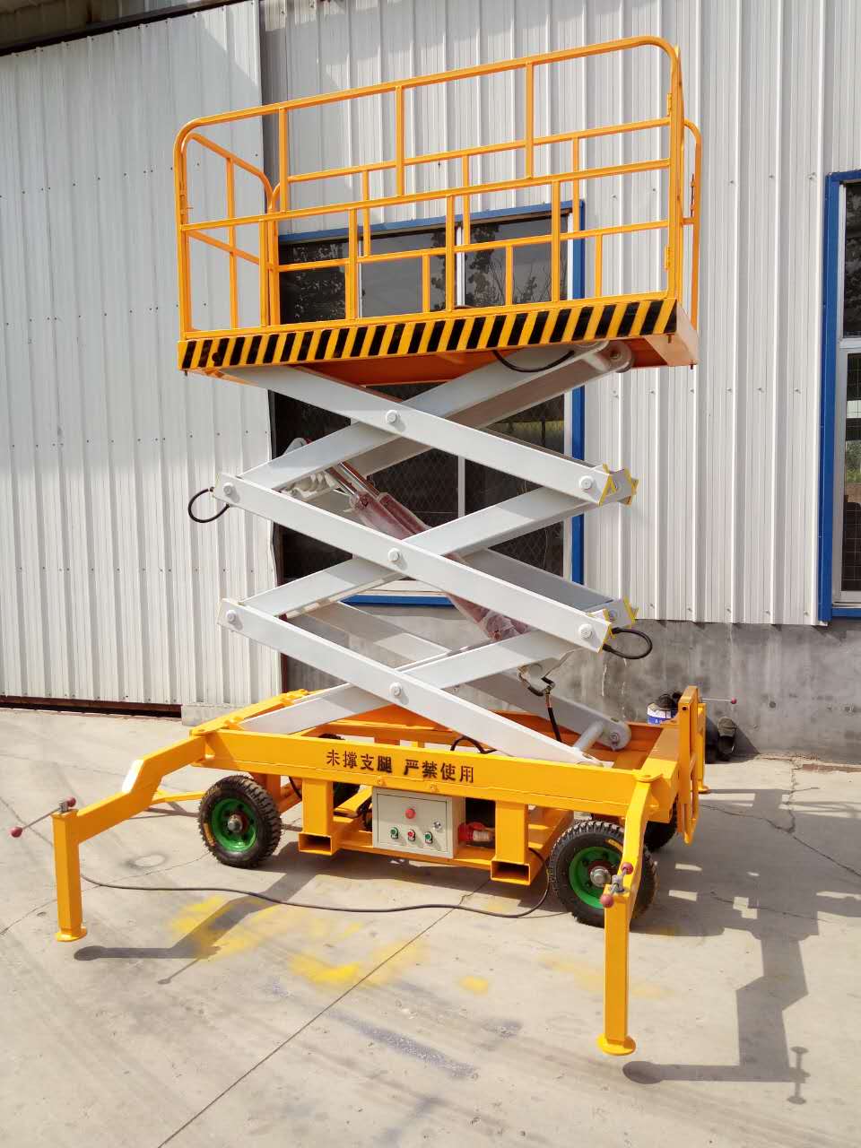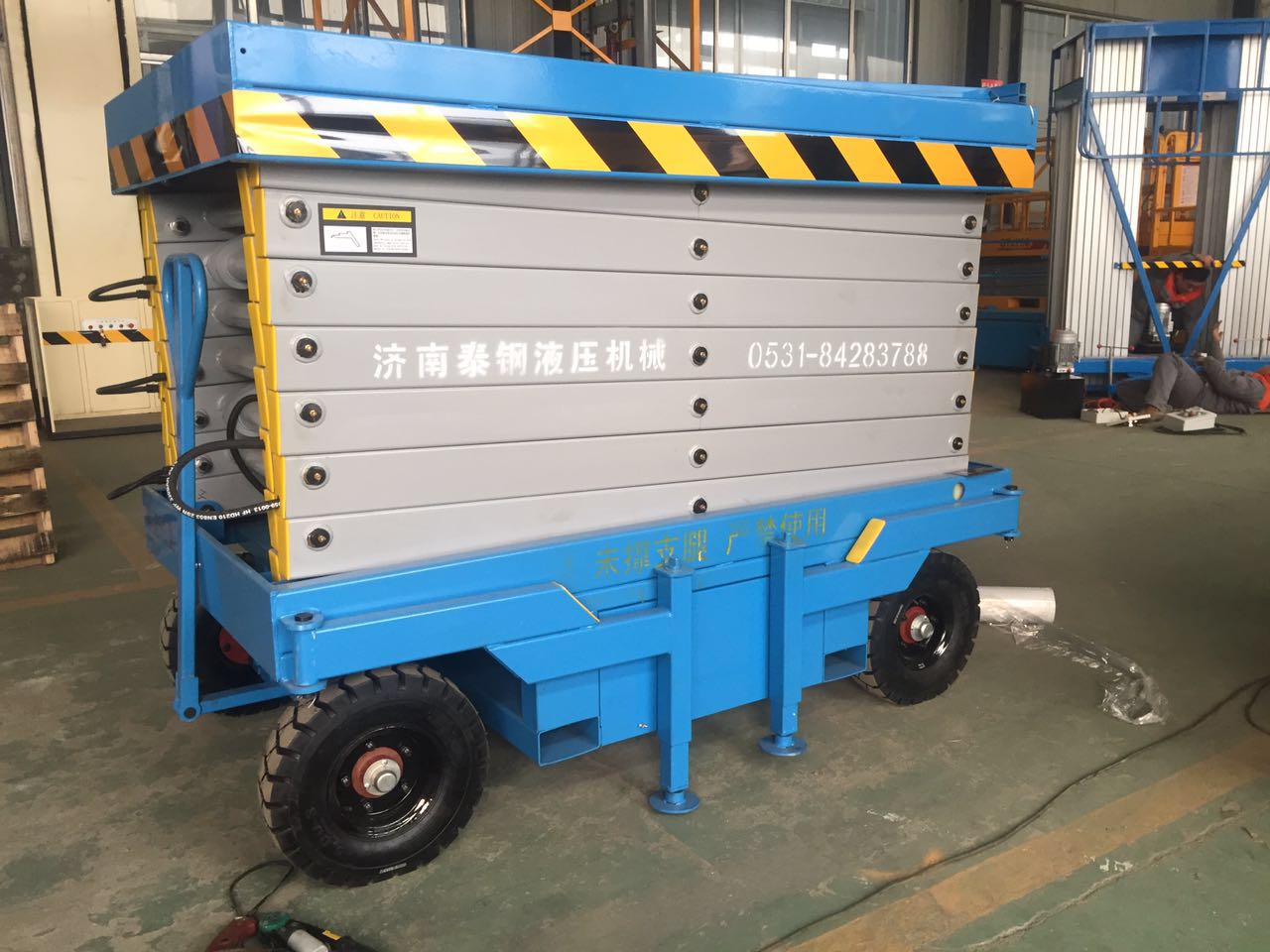 移動式液壓升降機,采用外來動力做牽引升降機械設備,垂直升降,其剪叉主結構采用上海寶鋼錳鋼矩形管制作,工作臺面寬大,結構堅固, 承載能力高,升降平穩(wěn),安裝維護簡單方便,可多人同時工作,使高空作業(yè)更安全、效率更高。根據(jù)其的使用環(huán)境和使用要求,可以選擇不同的動力組合,選擇不同的可選配置,完成舉升物品等任務,取得更好的使用效果。通過剪叉數(shù)量的增加來提高升降機能夠到達的高度,平臺采用電動升降控制。另備有手動液壓泵,停電時可通過手動形式達到設備升降目的。臺面設有防滑絕緣扣板,保證貨物及人員的安全,更換方便,易于清潔,整體美觀大氣。移動剪叉式電動升降機上還設置了防爆閥及應急下降閥等安全保護裝置,在停電時可以通過手動的形式達到設備升降,舉升貨物或高空作業(yè)的目的,帶來極大便利。