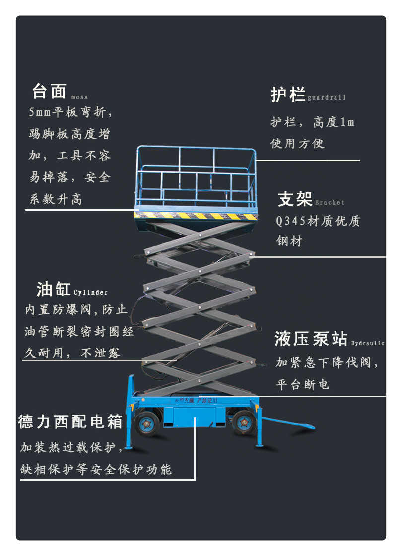 移動式液壓升降機,采用外來動力做牽引升降機械設(shè)備,垂直升降,其剪叉主結(jié)構(gòu)采用上海寶鋼錳鋼矩形管制作,工作臺面寬大,結(jié)構(gòu)堅固, 承載能力高,升降平穩(wěn),安裝維護簡單方便,可多人同時工作,使高空作業(yè)更安全、效率更高。根據(jù)其的使用環(huán)境和使用要求,可以選擇不同的動力組合,選擇不同的可選配置,完成舉升物品等任務(wù),取得更好的使用效果。通過剪叉數(shù)量的增加來提高升降機能夠到達的高度,平臺采用電動升降控制。另備有手動液壓泵,停電時可通過手動形式達到設(shè)備升降目的。臺面設(shè)有防滑絕緣扣板,保證貨物及人員的安全,更換方便,易于清潔,整體美觀大氣。移動剪叉式電動升降機上還設(shè)置了防爆閥及應(yīng)急下降閥等安全保護裝置,在停電時可以通過手動的形式達到設(shè)備升降,舉升貨物或高空作業(yè)的目的,帶來極大便利。